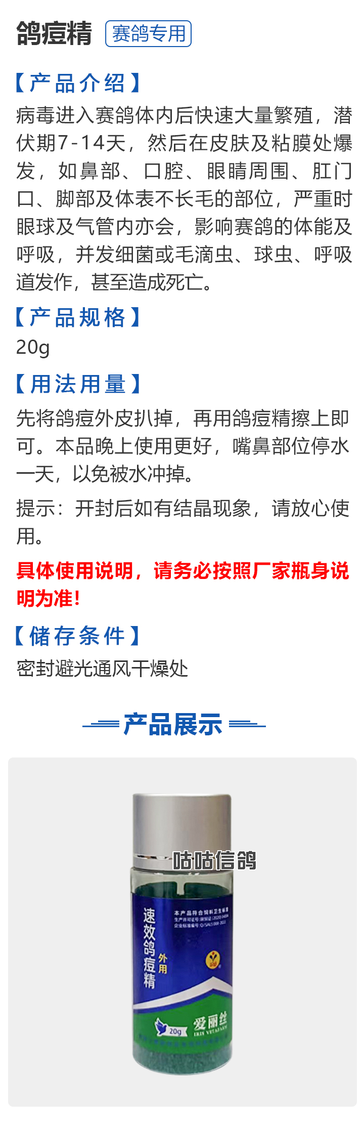 2026线上春展▪6元无门槛  -  指定商品:【爆灯】蓝精零 5克×10包 ;【爆灯】鸽滴威 5克×10包 ;【爆灯】莎门停 5克×10包 ;【爆灯】崇威灵 5克×10包 体内虫;【爆灯】益南混甘 5克×10包 ;【爆灯】回利球 5克×10包 ;【心连心】滴莎 10克×6袋;【爆灯】乎滴亢 5克×10包 ;【爆灯】超浓缩喜乐菌 500毫升 ;【心连心】球莎 10克×6袋 ;【爆灯】维诺护肝精 250毫升 ;【爆灯】虱螨体虫清 500毫升 ;【心连心】呼畅 10克×6袋 ;【爆灯】球可定 100毫升 ;【爆灯】复合预混合饲料Ⅱ维益菌 227克 ;【心连心】瘟痢停 10克×6袋 ;【爆灯】肠道宝 500克 ;【心连心】莎J净 10克×6袋 ;【心连心】鸽C净 10克×6袋 ;【顶峰】复合菌(胶囊)100粒 ;【顶峰】复合菌(粉剂) 280克 ;【顶峰】能量钙(浓缩型) 400毫升 ;【爱丽丝】喉痢清(加强型) 60粒(胶囊) ;【顶峰】能量钙(浓缩型) 2.5升 ;【爱丽丝】衣元净 60粒(胶囊);【施德福】特号六合一混合剂 5克×10包 ;【爱丽丝】毛滴虫净 60粒(胶囊);【爱丽丝】刹杆净(原沙门氏菌大肠杆菌杀星) 60粒(胶囊);【施德福】口服苗A 5克×10包 ;【爱丽丝】肝精 5克×10袋 ;【施德福】卡尼丁肝肾液 250毫升 ;【施德福】精华液 250毫升 ;【爱丽丝】呼吸道特号 60粒 (胶囊) ;【施德福】口服苗液 25毫升 ;【天津版稳拿】稳拿一号(呼吸道) 2公克×8袋 呼吸道;【天津版稳拿】稳拿二号(消化肠道) 3公克×8袋 肠道;【天津版稳拿】稳拿七号(毛滴虫) 2公克×8袋 毛滴虫;【上海龙园】魔宝 1000克 袋装;【上海龙园】维他肝精 250毫升 ;【上海龙园】鸽绿茶 100克 ;【上海龙园】浴宝 200克 ;【上海龙园】小育雏宝胶囊 100粒 ;【上海龙园】菌乐多 500毫升;【先锋】呼喉霸 5克×10包;【先锋】依原净 5克×10包 ;【西安凯鸽】客线枉 30毫升;【西安凯鸽】至樽独霸 100克;【西安凯鸽】至樽独霸 60粒(胶囊);【爆灯】T5鸽疫快克 20毫升 ;【西安凯鸽】果蔬营养丸 700克;【西安凯鸽】果蔬营养丸 2000克;【天津版稳拿】稳拿三号 2克×8包 球虫;【天津版稳拿】幼鸽夺霸 100粒 ;【天津版稳拿】幼鸽夺霸 300粒 ;【天津版稳拿】比赛夺霸3号 100粒 ;【天津版稳拿】比赛夺霸3号 300粒 ;【心连心】毛莎胶囊 60粒 ;【心连心】球锋胶囊 60粒 ;【天津版稳拿】虫清 3克×8包 体内虫;【心连心】呼畅 60粒(胶囊) ;【天津版稳拿】喉清 3克×8包 支原体/衣原体/念珠菌/呼吸道;【心连心】瘟痢停 60粒(胶囊) ;【天津版稳拿】粮霉清 200克 ;【心连心】莎J净胶囊 60粒 ;【爆灯】一滴灵 10毫升 单眼伤风;【爆灯】呼鼻灵 10毫升 ;【心连心】鸽C净 60粒(胶囊) ;【爆灯】维诺速补 100粒 ;【爆灯】老鸟回春丸 100粒 ;【心连心】毛呼二合一 10克×6袋;【爆灯】老鸟生子丸 100粒;【爆灯】依圆青 5克×10袋 ;【心连心】百消砃 100丸 ;【爆灯】泰力福 5克×10袋 呼吸道;【心连心】百消潵 150克 ;【爆灯】卫康防火墙 500毫升 ;【爆灯】矿力高峰液 250毫升;【心连心】独利双清 250毫升 ;【心连心】二合一啤酒酵母粉 600克 ;【爆灯】钙力奇 250毫升;【心连心】益酶多维电解质 150克 ;【爆灯】本草亢独饮 250毫升 ;【心连心】强化肝精(粉剂) 10克×10袋 ;【先锋】呼爽先锋 5克×10包 ;【心连心】强化肝精浓缩液 120毫升 ;【先锋】呼毛二合一 5克×10包 ;李猛推荐【爆灯】鸽疫康 500毫升 ;【先锋】先锋三合一 5克×10包 球虫/毛滴虫/沙门氏;【心连心】生物多肽矿物磷钙粉 500克 ;【先锋】净滴先锋 5克×10包;【心连心】AM活菌浓缩液 500毫升 ;【先锋】不脱翼 5毫升;李猛推荐【爆灯】维诺保 100毫升 ;【心连心】多效营养精华素 1680克 ;【心连心】AD3磷钙液 250毫升 ;【爆灯】超能素5000 1500克袋装 ;【心连心】瘟痢停丸 60丸 ;【爆灯】复合预混合饲料/6合1能量营养素 250克 ;【心连心】优益活菌液 1000毫升 ;【爱丽丝】喉痢清 5克×10袋 ;【上海龙园】种鸽宝 300粒 ;【上海龙园】种鸽粉 200克 ;【爱丽丝】衣原净2代 5克×10袋 ;【上海龙园】一喷灵 25毫升 ;【爱丽丝】毛滴净 5克×10袋 ;【上海龙园】绿色精 500毫升;【爱丽丝】刹杆净(原沙门氏菌大肠杆菌杀星) 5克×10袋 ;【上海龙园】营养蒜油 200毫升;【爱丽丝】呼吸道特号 5克×10袋 ;【上海龙园】康飞力 200毫升;【顶峰】保比液 100毫升 ;【上海龙园】赛神滴眼液 10毫升 ;【爱丽丝】毛球二合一 5克×10袋 ;【上海龙园】一滴灵 10毫升 单眼伤风;【爱丽丝】毛滴虫球虫二合一 60粒 ;【上海龙园】泻必停 5克×10袋 ;【顶峰】牛至香酚保比液 500毫升 ;【上海龙园】喉必清 5克×10袋;【顶峰】商寒停 100片 伤寒停;【顶峰】能量钙 300克 ;【上海龙园】抗球粉 5克×10包;【爱丽丝】稳肠赢 100克 ;【顶峰】全能电解质 500毫升 ;【上海龙园】抗滴粉 5克×10包 ;【顶峰】维他酵母粉 800克 ;【上海龙园】电解质维生素C粉 (甲7.5克+乙12.5克)×10组盒;【上海龙园】小育雏宝片剂 100片;【上海龙园】大育雏宝胶囊 500粒;【上海龙园】嗉囊清 100毫升;【上海龙园】大育雏宝片剂 500片;【上海龙园】粒粒成 100粒;【上海龙园】克虫宝 80粒;【上海龙园】红茶 100克;【上海龙园】强健宝 750克;【凡赛尔】欧乐强 鸽浴粉 1000克 天然沐浴圣品/消除肌肉疲劳/洗澡/洗浴;【爱丽丝】钙磷营养速补 400片;【北斗】雌宝 100粒;【北斗】雄宝 100粒 ;【北斗】克立停 100粒;【北斗】育雏宝 300粒;【天津版稳拿】稳拿五号 3克×8包 单眼伤风;【爆灯】多关秘密武器 30毫升 ;【爆灯】