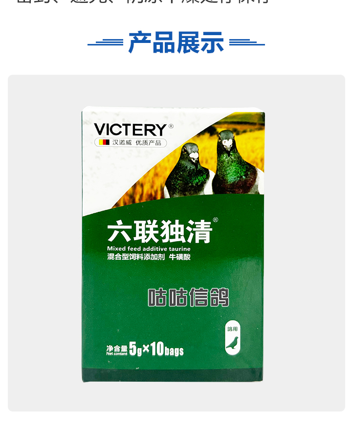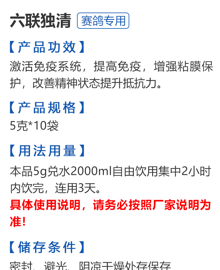 2026线上春展▪6元无门槛  -  指定商品:【爆灯】蓝精零 5克×10包 ;【爆灯】鸽滴威 5克×10包 ;【爆灯】莎门停 5克×10包 ;【爆灯】崇威灵 5克×10包 体内虫;【爆灯】益南混甘 5克×10包 ;【爆灯】回利球 5克×10包 ;【心连心】滴莎 10克×6袋;【爆灯】乎滴亢 5克×10包 ;【爆灯】超浓缩喜乐菌 500毫升 ;【心连心】球莎 10克×6袋 ;【爆灯】维诺护肝精 250毫升 ;【爆灯】虱螨体虫清 500毫升 ;【心连心】呼畅 10克×6袋 ;【爆灯】球可定 100毫升 ;【爆灯】复合预混合饲料Ⅱ维益菌 227克 ;【心连心】瘟痢停 10克×6袋 ;【爆灯】肠道宝 500克 ;【心连心】莎J净 10克×6袋 ;【心连心】鸽C净 10克×6袋 ;【顶峰】复合菌(胶囊)100粒 ;【顶峰】复合菌(粉剂) 280克 ;【顶峰】能量钙(浓缩型) 400毫升 ;【爱丽丝】喉痢清(加强型) 60粒(胶囊) ;【顶峰】能量钙(浓缩型) 2.5升 ;【爱丽丝】衣元净 60粒(胶囊);【施德福】特号六合一混合剂 5克×10包 ;【爱丽丝】毛滴虫净 60粒(胶囊);【爱丽丝】刹杆净(原沙门氏菌大肠杆菌杀星) 60粒(胶囊);【施德福】口服苗A 5克×10包 ;【爱丽丝】肝精 5克×10袋 ;【施德福】卡尼丁肝肾液 250毫升 ;【施德福】精华液 250毫升 ;【爱丽丝】呼吸道特号 60粒 (胶囊) ;【施德福】口服苗液 25毫升 ;【天津版稳拿】稳拿一号(呼吸道) 2公克×8袋 呼吸道;【天津版稳拿】稳拿二号(消化肠道) 3公克×8袋 肠道;【天津版稳拿】稳拿七号(毛滴虫) 2公克×8袋 毛滴虫;【上海龙园】魔宝 1000克 袋装;【上海龙园】维他肝精 250毫升 ;【上海龙园】鸽绿茶 100克 ;【上海龙园】浴宝 200克 ;【上海龙园】小育雏宝胶囊 100粒 ;【上海龙园】菌乐多 500毫升;【先锋】呼喉霸 5克×10包;【先锋】依原净 5克×10包 ;【西安凯鸽】客线枉 30毫升;【西安凯鸽】至樽独霸 100克;【西安凯鸽】至樽独霸 60粒(胶囊);【爆灯】T5鸽疫快克 20毫升 ;【西安凯鸽】果蔬营养丸 700克;【西安凯鸽】果蔬营养丸 2000克;【天津版稳拿】稳拿三号 2克×8包 球虫;【天津版稳拿】幼鸽夺霸 100粒 ;【天津版稳拿】幼鸽夺霸 300粒 ;【天津版稳拿】比赛夺霸3号 100粒 ;【天津版稳拿】比赛夺霸3号 300粒 ;【心连心】毛莎胶囊 60粒 ;【心连心】球锋胶囊 60粒 ;【天津版稳拿】虫清 3克×8包 体内虫;【心连心】呼畅 60粒(胶囊) ;【天津版稳拿】喉清 3克×8包 支原体/衣原体/念珠菌/呼吸道;【心连心】瘟痢停 60粒(胶囊) ;【天津版稳拿】粮霉清 200克 ;【心连心】莎J净胶囊 60粒 ;【爆灯】一滴灵 10毫升 单眼伤风;【爆灯】呼鼻灵 10毫升 ;【心连心】鸽C净 60粒(胶囊) ;【爆灯】维诺速补 100粒 ;【爆灯】老鸟回春丸 100粒 ;【心连心】毛呼二合一 10克×6袋;【爆灯】老鸟生子丸 100粒;【爆灯】依圆青 5克×10袋 ;【心连心】百消砃 100丸 ;【爆灯】泰力福 5克×10袋 呼吸道;【心连心】百消潵 150克 ;【爆灯】卫康防火墙 500毫升 ;【爆灯】矿力高峰液 250毫升;【心连心】独利双清 250毫升 ;【心连心】二合一啤酒酵母粉 600克 ;【爆灯】钙力奇 250毫升;【心连心】益酶多维电解质 150克 ;【爆灯】本草亢独饮 250毫升 ;【心连心】强化肝精(粉剂) 10克×10袋 ;【先锋】呼爽先锋 5克×10包 ;【心连心】强化肝精浓缩液 120毫升 ;【先锋】呼毛二合一 5克×10包 ;李猛推荐【爆灯】鸽疫康 500毫升 ;【先锋】先锋三合一 5克×10包 球虫/毛滴虫/沙门氏;【心连心】生物多肽矿物磷钙粉 500克 ;【先锋】净滴先锋 5克×10包;【心连心】AM活菌浓缩液 500毫升 ;【先锋】不脱翼 5毫升;李猛推荐【爆灯】维诺保 100毫升 ;【心连心】多效营养精华素 1680克 ;【心连心】AD3磷钙液 250毫升 ;【爆灯】超能素5000 1500克袋装 ;【心连心】瘟痢停丸 60丸 ;【爆灯】复合预混合饲料/6合1能量营养素 250克 ;【心连心】优益活菌液 1000毫升 ;【爱丽丝】喉痢清 5克×10袋 ;【上海龙园】种鸽宝 300粒 ;【上海龙园】种鸽粉 200克 ;【爱丽丝】衣原净2代 5克×10袋 ;【上海龙园】一喷灵 25毫升 ;【爱丽丝】毛滴净 5克×10袋 ;【上海龙园】绿色精 500毫升;【爱丽丝】刹杆净(原沙门氏菌大肠杆菌杀星) 5克×10袋 ;【上海龙园】营养蒜油 200毫升;【爱丽丝】呼吸道特号 5克×10袋 ;【上海龙园】康飞力 200毫升;【顶峰】保比液 100毫升 ;【上海龙园】赛神滴眼液 10毫升 ;【爱丽丝】毛球二合一 5克×10袋 ;【上海龙园】一滴灵 10毫升 单眼伤风;【爱丽丝】毛滴虫球虫二合一 60粒 ;【上海龙园】泻必停 5克×10袋 ;【顶峰】牛至香酚保比液 500毫升 ;【上海龙园】喉必清 5克×10袋;【顶峰】商寒停 100片 伤寒停;【顶峰】能量钙 300克 ;【上海龙园】抗球粉 5克×10包;【爱丽丝】稳肠赢 100克 ;【顶峰】全能电解质 500毫升 ;【上海龙园】抗滴粉 5克×10包 ;【顶峰】维他酵母粉 800克 ;【上海龙园】电解质维生素C粉 (甲7.5克+乙12.5克)×10组盒;【上海龙园】小育雏宝片剂 100片;【上海龙园】大育雏宝胶囊 500粒;【上海龙园】嗉囊清 100毫升;【上海龙园】大育雏宝片剂 500片;【上海龙园】粒粒成 100粒;【上海龙园】克虫宝 80粒;【上海龙园】红茶 100克;【上海龙园】强健宝 750克;【凡赛尔】欧乐强 鸽浴粉 1000克 天然沐浴圣品/消除肌肉疲劳/洗澡/洗浴;【爱丽丝】钙磷营养速补 400片;【北斗】雌宝 100粒;【北斗】雄宝 100粒 ;【北斗】克立停 100粒;【北斗】育雏宝 300粒;【天津版稳拿】稳拿五号 3克×8包 单眼伤风;【爆灯】多关秘密武器 30毫升 ;【爆灯】