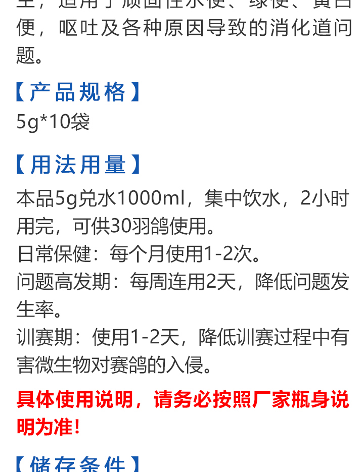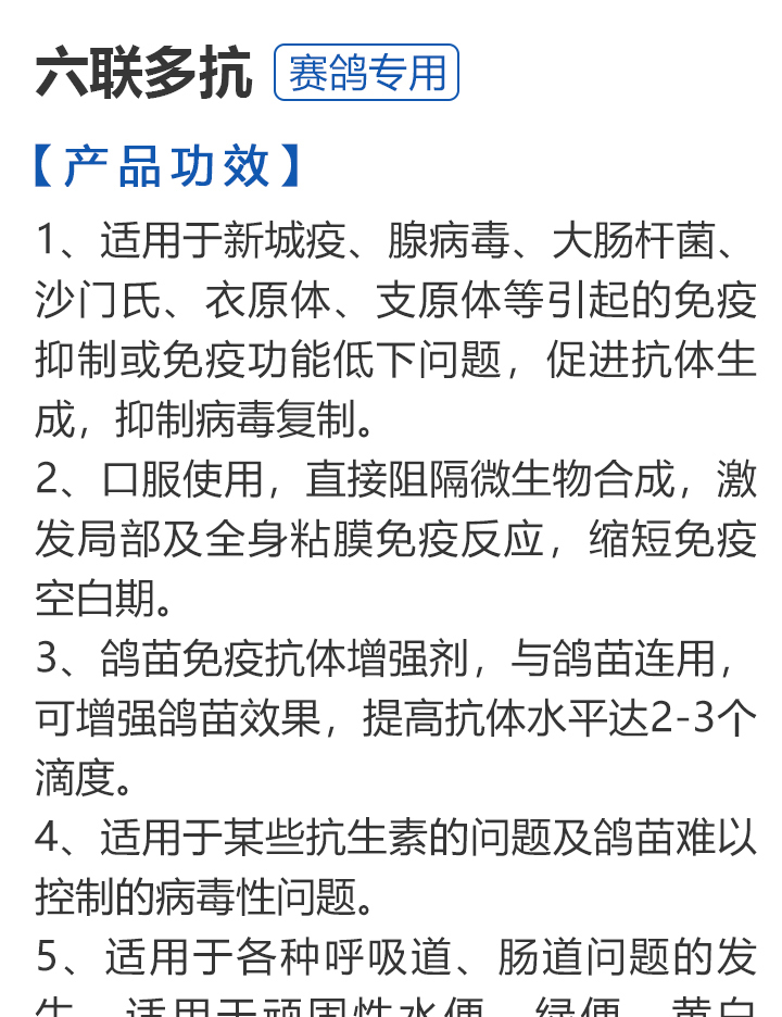 2026线上春展▪6元无门槛  -  指定商品:【爆灯】蓝精零 5克×10包 ;【爆灯】鸽滴威 5克×10包 ;【爆灯】莎门停 5克×10包 ;【爆灯】崇威灵 5克×10包 体内虫;【爆灯】益南混甘 5克×10包 ;【爆灯】回利球 5克×10包 ;【心连心】滴莎 10克×6袋;【爆灯】乎滴亢 5克×10包 ;【爆灯】超浓缩喜乐菌 500毫升 ;【心连心】球莎 10克×6袋 ;【爆灯】维诺护肝精 250毫升 ;【爆灯】虱螨体虫清 500毫升 ;【心连心】呼畅 10克×6袋 ;【爆灯】球可定 100毫升 ;【爆灯】复合预混合饲料Ⅱ维益菌 227克 ;【心连心】瘟痢停 10克×6袋 ;【爆灯】肠道宝 500克 ;【心连心】莎J净 10克×6袋 ;【心连心】鸽C净 10克×6袋 ;【顶峰】复合菌(胶囊)100粒 ;【顶峰】复合菌(粉剂) 280克 ;【顶峰】能量钙(浓缩型) 400毫升 ;【爱丽丝】喉痢清(加强型) 60粒(胶囊) ;【顶峰】能量钙(浓缩型) 2.5升 ;【爱丽丝】衣元净 60粒(胶囊);【施德福】特号六合一混合剂 5克×10包 ;【爱丽丝】毛滴虫净 60粒(胶囊);【爱丽丝】刹杆净(原沙门氏菌大肠杆菌杀星) 60粒(胶囊);【施德福】口服苗A 5克×10包 ;【爱丽丝】肝精 5克×10袋 ;【施德福】卡尼丁肝肾液 250毫升 ;【施德福】精华液 250毫升 ;【爱丽丝】呼吸道特号 60粒 (胶囊) ;【施德福】口服苗液 25毫升 ;【天津版稳拿】稳拿一号(呼吸道) 2公克×8袋 呼吸道;【天津版稳拿】稳拿二号(消化肠道) 3公克×8袋 肠道;【天津版稳拿】稳拿七号(毛滴虫) 2公克×8袋 毛滴虫;【上海龙园】魔宝 1000克 袋装;【上海龙园】维他肝精 250毫升 ;【上海龙园】鸽绿茶 100克 ;【上海龙园】浴宝 200克 ;【上海龙园】小育雏宝胶囊 100粒 ;【上海龙园】菌乐多 500毫升;【先锋】呼喉霸 5克×10包;【先锋】依原净 5克×10包 ;【西安凯鸽】客线枉 30毫升;【西安凯鸽】至樽独霸 100克;【西安凯鸽】至樽独霸 60粒(胶囊);【爆灯】T5鸽疫快克 20毫升 ;【西安凯鸽】果蔬营养丸 700克;【西安凯鸽】果蔬营养丸 2000克;【天津版稳拿】稳拿三号 2克×8包 球虫;【天津版稳拿】幼鸽夺霸 100粒 ;【天津版稳拿】幼鸽夺霸 300粒 ;【天津版稳拿】比赛夺霸3号 100粒 ;【天津版稳拿】比赛夺霸3号 300粒 ;【心连心】毛莎胶囊 60粒 ;【心连心】球锋胶囊 60粒 ;【天津版稳拿】虫清 3克×8包 体内虫;【心连心】呼畅 60粒(胶囊) ;【天津版稳拿】喉清 3克×8包 支原体/衣原体/念珠菌/呼吸道;【心连心】瘟痢停 60粒(胶囊) ;【天津版稳拿】粮霉清 200克 ;【心连心】莎J净胶囊 60粒 ;【爆灯】一滴灵 10毫升 单眼伤风;【爆灯】呼鼻灵 10毫升 ;【心连心】鸽C净 60粒(胶囊) ;【爆灯】维诺速补 100粒 ;【爆灯】老鸟回春丸 100粒 ;【心连心】毛呼二合一 10克×6袋;【爆灯】老鸟生子丸 100粒;【爆灯】依圆青 5克×10袋 ;【心连心】百消砃 100丸 ;【爆灯】泰力福 5克×10袋 呼吸道;【心连心】百消潵 150克 ;【爆灯】卫康防火墙 500毫升 ;【爆灯】矿力高峰液 250毫升;【心连心】独利双清 250毫升 ;【心连心】二合一啤酒酵母粉 600克 ;【爆灯】钙力奇 250毫升;【心连心】益酶多维电解质 150克 ;【爆灯】本草亢独饮 250毫升 ;【心连心】强化肝精(粉剂) 10克×10袋 ;【先锋】呼爽先锋 5克×10包 ;【心连心】强化肝精浓缩液 120毫升 ;【先锋】呼毛二合一 5克×10包 ;李猛推荐【爆灯】鸽疫康 500毫升 ;【先锋】先锋三合一 5克×10包 球虫/毛滴虫/沙门氏;【心连心】生物多肽矿物磷钙粉 500克 ;【先锋】净滴先锋 5克×10包;【心连心】AM活菌浓缩液 500毫升 ;【先锋】不脱翼 5毫升;李猛推荐【爆灯】维诺保 100毫升 ;【心连心】多效营养精华素 1680克 ;【心连心】AD3磷钙液 250毫升 ;【爆灯】超能素5000 1500克袋装 ;【心连心】瘟痢停丸 60丸 ;【爆灯】复合预混合饲料/6合1能量营养素 250克 ;【心连心】优益活菌液 1000毫升 ;【爱丽丝】喉痢清 5克×10袋 ;【上海龙园】种鸽宝 300粒 ;【上海龙园】种鸽粉 200克 ;【爱丽丝】衣原净2代 5克×10袋 ;【上海龙园】一喷灵 25毫升 ;【爱丽丝】毛滴净 5克×10袋 ;【上海龙园】绿色精 500毫升;【爱丽丝】刹杆净(原沙门氏菌大肠杆菌杀星) 5克×10袋 ;【上海龙园】营养蒜油 200毫升;【爱丽丝】呼吸道特号 5克×10袋 ;【上海龙园】康飞力 200毫升;【顶峰】保比液 100毫升 ;【上海龙园】赛神滴眼液 10毫升 ;【爱丽丝】毛球二合一 5克×10袋 ;【上海龙园】一滴灵 10毫升 单眼伤风;【爱丽丝】毛滴虫球虫二合一 60粒 ;【上海龙园】泻必停 5克×10袋 ;【顶峰】牛至香酚保比液 500毫升 ;【上海龙园】喉必清 5克×10袋;【顶峰】商寒停 100片 伤寒停;【顶峰】能量钙 300克 ;【上海龙园】抗球粉 5克×10包;【爱丽丝】稳肠赢 100克 ;【顶峰】全能电解质 500毫升 ;【上海龙园】抗滴粉 5克×10包 ;【顶峰】维他酵母粉 800克 ;【上海龙园】电解质维生素C粉 (甲7.5克+乙12.5克)×10组盒;【上海龙园】小育雏宝片剂 100片;【上海龙园】大育雏宝胶囊 500粒;【上海龙园】嗉囊清 100毫升;【上海龙园】大育雏宝片剂 500片;【上海龙园】粒粒成 100粒;【上海龙园】克虫宝 80粒;【上海龙园】红茶 100克;【上海龙园】强健宝 750克;【凡赛尔】欧乐强 鸽浴粉 1000克 天然沐浴圣品/消除肌肉疲劳/洗澡/洗浴;【爱丽丝】钙磷营养速补 400片;【北斗】雌宝 100粒;【北斗】雄宝 100粒 ;【北斗】克立停 100粒;【北斗】育雏宝 300粒;【天津版稳拿】稳拿五号 3克×8包 单眼伤风;【爆灯】多关秘密武器 30毫升 ;【爆灯】