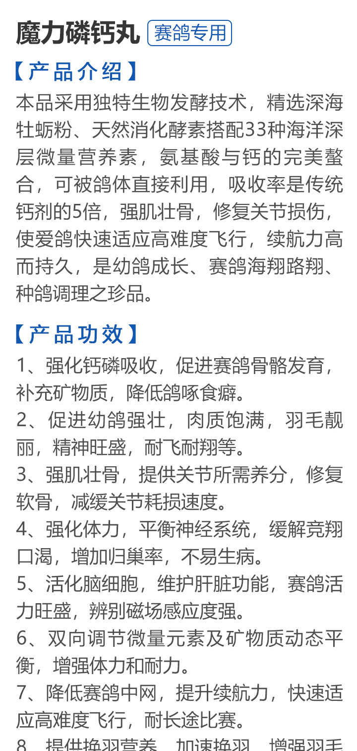 2026线上春展▪6元无门槛  -  指定商品:【爆灯】蓝精零 5克×10包 ;【爆灯】鸽滴威 5克×10包 ;【爆灯】莎门停 5克×10包 ;【爆灯】崇威灵 5克×10包 体内虫;【爆灯】益南混甘 5克×10包 ;【爆灯】回利球 5克×10包 ;【心连心】滴莎 10克×6袋;【爆灯】乎滴亢 5克×10包 ;【爆灯】超浓缩喜乐菌 500毫升 ;【心连心】球莎 10克×6袋 ;【爆灯】维诺护肝精 250毫升 ;【爆灯】虱螨体虫清 500毫升 ;【心连心】呼畅 10克×6袋 ;【爆灯】球可定 100毫升 ;【爆灯】复合预混合饲料Ⅱ维益菌 227克 ;【心连心】瘟痢停 10克×6袋 ;【爆灯】肠道宝 500克 ;【心连心】莎J净 10克×6袋 ;【心连心】鸽C净 10克×6袋 ;【顶峰】复合菌(胶囊)100粒 ;【顶峰】复合菌(粉剂) 280克 ;【顶峰】能量钙(浓缩型) 400毫升 ;【爱丽丝】喉痢清(加强型) 60粒(胶囊) ;【顶峰】能量钙(浓缩型) 2.5升 ;【爱丽丝】衣元净 60粒(胶囊);【施德福】特号六合一混合剂 5克×10包 ;【爱丽丝】毛滴虫净 60粒(胶囊);【爱丽丝】刹杆净(原沙门氏菌大肠杆菌杀星) 60粒(胶囊);【施德福】口服苗A 5克×10包 ;【爱丽丝】肝精 5克×10袋 ;【施德福】卡尼丁肝肾液 250毫升 ;【施德福】精华液 250毫升 ;【爱丽丝】呼吸道特号 60粒 (胶囊) ;【施德福】口服苗液 25毫升 ;【天津版稳拿】稳拿一号(呼吸道) 2公克×8袋 呼吸道;【天津版稳拿】稳拿二号(消化肠道) 3公克×8袋 肠道;【天津版稳拿】稳拿七号(毛滴虫) 2公克×8袋 毛滴虫;【上海龙园】魔宝 1000克 袋装;【上海龙园】维他肝精 250毫升 ;【上海龙园】鸽绿茶 100克 ;【上海龙园】浴宝 200克 ;【上海龙园】小育雏宝胶囊 100粒 ;【上海龙园】菌乐多 500毫升;【先锋】呼喉霸 5克×10包;【先锋】依原净 5克×10包 ;【西安凯鸽】客线枉 30毫升;【西安凯鸽】至樽独霸 100克;【西安凯鸽】至樽独霸 60粒(胶囊);【爆灯】T5鸽疫快克 20毫升 ;【西安凯鸽】果蔬营养丸 700克;【西安凯鸽】果蔬营养丸 2000克;【天津版稳拿】稳拿三号 2克×8包 球虫;【天津版稳拿】幼鸽夺霸 100粒 ;【天津版稳拿】幼鸽夺霸 300粒 ;【天津版稳拿】比赛夺霸3号 100粒 ;【天津版稳拿】比赛夺霸3号 300粒 ;【心连心】毛莎胶囊 60粒 ;【心连心】球锋胶囊 60粒 ;【天津版稳拿】虫清 3克×8包 体内虫;【心连心】呼畅 60粒(胶囊) ;【天津版稳拿】喉清 3克×8包 支原体/衣原体/念珠菌/呼吸道;【心连心】瘟痢停 60粒(胶囊) ;【天津版稳拿】粮霉清 200克 ;【心连心】莎J净胶囊 60粒 ;【爆灯】一滴灵 10毫升 单眼伤风;【爆灯】呼鼻灵 10毫升 ;【心连心】鸽C净 60粒(胶囊) ;【爆灯】维诺速补 100粒 ;【爆灯】老鸟回春丸 100粒 ;【心连心】毛呼二合一 10克×6袋;【爆灯】老鸟生子丸 100粒;【爆灯】依圆青 5克×10袋 ;【心连心】百消砃 100丸 ;【爆灯】泰力福 5克×10袋 呼吸道;【心连心】百消潵 150克 ;【爆灯】卫康防火墙 500毫升 ;【爆灯】矿力高峰液 250毫升;【心连心】独利双清 250毫升 ;【心连心】二合一啤酒酵母粉 600克 ;【爆灯】钙力奇 250毫升;【心连心】益酶多维电解质 150克 ;【爆灯】本草亢独饮 250毫升 ;【心连心】强化肝精(粉剂) 10克×10袋 ;【先锋】呼爽先锋 5克×10包 ;【心连心】强化肝精浓缩液 120毫升 ;【先锋】呼毛二合一 5克×10包 ;李猛推荐【爆灯】鸽疫康 500毫升 ;【先锋】先锋三合一 5克×10包 球虫/毛滴虫/沙门氏;【心连心】生物多肽矿物磷钙粉 500克 ;【先锋】净滴先锋 5克×10包;【心连心】AM活菌浓缩液 500毫升 ;【先锋】不脱翼 5毫升;李猛推荐【爆灯】维诺保 100毫升 ;【心连心】多效营养精华素 1680克 ;【心连心】AD3磷钙液 250毫升 ;【爆灯】超能素5000 1500克袋装 ;【心连心】瘟痢停丸 60丸 ;【爆灯】复合预混合饲料/6合1能量营养素 250克 ;【心连心】优益活菌液 1000毫升 ;【爱丽丝】喉痢清 5克×10袋 ;【上海龙园】种鸽宝 300粒 ;【上海龙园】种鸽粉 200克 ;【爱丽丝】衣原净2代 5克×10袋 ;【上海龙园】一喷灵 25毫升 ;【爱丽丝】毛滴净 5克×10袋 ;【上海龙园】绿色精 500毫升;【爱丽丝】刹杆净(原沙门氏菌大肠杆菌杀星) 5克×10袋 ;【上海龙园】营养蒜油 200毫升;【爱丽丝】呼吸道特号 5克×10袋 ;【上海龙园】康飞力 200毫升;【顶峰】保比液 100毫升 ;【上海龙园】赛神滴眼液 10毫升 ;【爱丽丝】毛球二合一 5克×10袋 ;【上海龙园】一滴灵 10毫升 单眼伤风;【爱丽丝】毛滴虫球虫二合一 60粒 ;【上海龙园】泻必停 5克×10袋 ;【顶峰】牛至香酚保比液 500毫升 ;【上海龙园】喉必清 5克×10袋;【顶峰】商寒停 100片 伤寒停;【顶峰】能量钙 300克 ;【上海龙园】抗球粉 5克×10包;【爱丽丝】稳肠赢 100克 ;【顶峰】全能电解质 500毫升 ;【上海龙园】抗滴粉 5克×10包 ;【顶峰】维他酵母粉 800克 ;【上海龙园】电解质维生素C粉 (甲7.5克+乙12.5克)×10组盒;【上海龙园】小育雏宝片剂 100片;【上海龙园】大育雏宝胶囊 500粒;【上海龙园】嗉囊清 100毫升;【上海龙园】大育雏宝片剂 500片;【上海龙园】粒粒成 100粒;【上海龙园】克虫宝 80粒;【上海龙园】红茶 100克;【上海龙园】强健宝 750克;【凡赛尔】欧乐强 鸽浴粉 1000克 天然沐浴圣品/消除肌肉疲劳/洗澡/洗浴;【爱丽丝】钙磷营养速补 400片;【北斗】雌宝 100粒;【北斗】雄宝 100粒 ;【北斗】克立停 100粒;【北斗】育雏宝 300粒;【天津版稳拿】稳拿五号 3克×8包 单眼伤风;【爆灯】多关秘密武器 30毫升 ;【爆灯】
