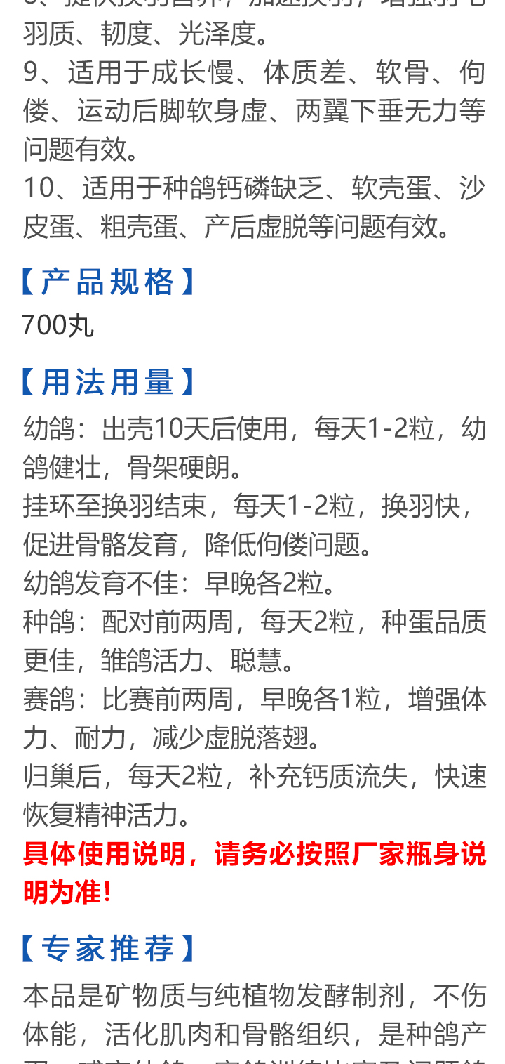 2026线上春展▪满600-40  -  指定商品:【爆灯】蓝精零 5克×10包 ;【爆灯】鸽滴威 5克×10包 ;【爆灯】莎门停 5克×10包 ;【爆灯】崇威灵 5克×10包 体内虫;【爆灯】益南混甘 5克×10包 ;【爆灯】回利球 5克×10包 ;【心连心】滴莎 10克×6袋;【爆灯】乎滴亢 5克×10包 ;【爆灯】超浓缩喜乐菌 500毫升 ;【心连心】球莎 10克×6袋 ;【爆灯】维诺护肝精 250毫升 ;【爆灯】虱螨体虫清 500毫升 ;【心连心】呼畅 10克×6袋 ;【爆灯】球可定 100毫升 ;【爆灯】复合预混合饲料Ⅱ维益菌 227克 ;【心连心】瘟痢停 10克×6袋 ;【爆灯】肠道宝 500克 ;【心连心】莎J净 10克×6袋 ;【心连心】鸽C净 10克×6袋 ;【顶峰】复合菌(胶囊)100粒 ;【顶峰】复合菌(粉剂) 280克 ;【顶峰】能量钙(浓缩型) 400毫升 ;【爱丽丝】喉痢清(加强型) 60粒(胶囊) ;【顶峰】能量钙(浓缩型) 2.5升 ;【爱丽丝】衣元净 60粒(胶囊);【施德福】特号六合一混合剂 5克×10包 ;【爱丽丝】毛滴虫净 60粒(胶囊);【爱丽丝】刹杆净(原沙门氏菌大肠杆菌杀星) 60粒(胶囊);【施德福】口服苗A 5克×10包 ;【爱丽丝】肝精 5克×10袋 ;【施德福】卡尼丁肝肾液 250毫升 ;【施德福】精华液 250毫升 ;【爱丽丝】呼吸道特号 60粒 (胶囊) ;【施德福】口服苗液 25毫升 ;【天津版稳拿】稳拿一号(呼吸道) 2公克×8袋 呼吸道;【天津版稳拿】稳拿二号(消化肠道) 3公克×8袋 肠道;【天津版稳拿】稳拿七号(毛滴虫) 2公克×8袋 毛滴虫;【上海龙园】魔宝 1000克 袋装;【上海龙园】维他肝精 250毫升 ;【上海龙园】鸽绿茶 100克 ;【上海龙园】浴宝 200克 ;【上海龙园】小育雏宝胶囊 100粒 ;【上海龙园】菌乐多 500毫升;【先锋】呼喉霸 5克×10包;【先锋】依原净 5克×10包 ;【西安凯鸽】客线枉 30毫升;【西安凯鸽】至樽独霸 100克;【西安凯鸽】至樽独霸 60粒(胶囊);【爆灯】T5鸽疫快克 20毫升 ;【西安凯鸽】果蔬营养丸 700克;【西安凯鸽】果蔬营养丸 2000克;【天津版稳拿】稳拿三号 2克×8包 球虫;【天津版稳拿】幼鸽夺霸 100粒 ;【天津版稳拿】幼鸽夺霸 300粒 ;【天津版稳拿】比赛夺霸3号 100粒 ;【天津版稳拿】比赛夺霸3号 300粒 ;【心连心】毛莎胶囊 60粒 ;【心连心】球锋胶囊 60粒 ;【天津版稳拿】虫清 3克×8包 体内虫;【心连心】呼畅 60粒(胶囊) ;【天津版稳拿】喉清 3克×8包 支原体/衣原体/念珠菌/呼吸道;【心连心】瘟痢停 60粒(胶囊) ;【天津版稳拿】粮霉清 200克 ;【心连心】莎J净胶囊 60粒 ;【爆灯】一滴灵 10毫升 单眼伤风;【爆灯】呼鼻灵 10毫升 ;【心连心】鸽C净 60粒(胶囊) ;【爆灯】维诺速补 100粒 ;【爆灯】老鸟回春丸 100粒 ;【心连心】毛呼二合一 10克×6袋;【爆灯】老鸟生子丸 100粒;【爆灯】依圆青 5克×10袋 ;【心连心】百消砃 100丸 ;【爆灯】泰力福 5克×10袋 呼吸道;【心连心】百消潵 150克 ;【爆灯】卫康防火墙 500毫升 ;【爆灯】矿力高峰液 250毫升;【心连心】独利双清 250毫升 ;【心连心】二合一啤酒酵母粉 600克 ;【爆灯】钙力奇 250毫升;【心连心】益酶多维电解质 150克 ;【爆灯】本草亢独饮 250毫升 ;【心连心】强化肝精(粉剂) 10克×10袋 ;【先锋】呼爽先锋 5克×10包 ;【心连心】强化肝精浓缩液 120毫升 ;【先锋】呼毛二合一 5克×10包 ;李猛推荐【爆灯】鸽疫康 500毫升 ;【先锋】先锋三合一 5克×10包 球虫/毛滴虫/沙门氏;【心连心】生物多肽矿物磷钙粉 500克 ;【先锋】净滴先锋 5克×10包;【心连心】AM活菌浓缩液 500毫升 ;【先锋】不脱翼 5毫升;李猛推荐【爆灯】维诺保 100毫升 ;【心连心】多效营养精华素 1680克 ;【心连心】AD3磷钙液 250毫升 ;【爆灯】超能素5000 1500克袋装 ;【心连心】瘟痢停丸 60丸 ;【爆灯】复合预混合饲料/6合1能量营养素 250克 ;【心连心】优益活菌液 1000毫升 ;【爱丽丝】喉痢清 5克×10袋 ;【上海龙园】种鸽宝 300粒 ;【上海龙园】种鸽粉 200克 ;【爱丽丝】衣原净2代 5克×10袋 ;【上海龙园】一喷灵 25毫升 ;【爱丽丝】毛滴净 5克×10袋 ;【上海龙园】绿色精 500毫升;【爱丽丝】刹杆净(原沙门氏菌大肠杆菌杀星) 5克×10袋 ;【上海龙园】营养蒜油 200毫升;【爱丽丝】呼吸道特号 5克×10袋 ;【上海龙园】康飞力 200毫升;【顶峰】保比液 100毫升 ;【上海龙园】赛神滴眼液 10毫升 ;【爱丽丝】毛球二合一 5克×10袋 ;【上海龙园】一滴灵 10毫升 单眼伤风;【爱丽丝】毛滴虫球虫二合一 60粒 ;【上海龙园】泻必停 5克×10袋 ;【顶峰】牛至香酚保比液 500毫升 ;【上海龙园】喉必清 5克×10袋;【顶峰】商寒停 100片 伤寒停;【顶峰】能量钙 300克 ;【上海龙园】抗球粉 5克×10包;【爱丽丝】稳肠赢 100克 ;【顶峰】全能电解质 500毫升 ;【上海龙园】抗滴粉 5克×10包 ;【顶峰】维他酵母粉 800克 ;【上海龙园】电解质维生素C粉 (甲7.5克+乙12.5克)×10组盒;【上海龙园】小育雏宝片剂 100片;【上海龙园】大育雏宝胶囊 500粒;【上海龙园】嗉囊清 100毫升;【上海龙园】大育雏宝片剂 500片;【上海龙园】粒粒成 100粒;【上海龙园】克虫宝 80粒;【上海龙园】红茶 100克;【上海龙园】强健宝 750克;【凡赛尔】欧乐强 鸽浴粉 1000克 天然沐浴圣品/消除肌肉疲劳/洗澡/洗浴;【爱丽丝】钙磷营养速补 400片;【北斗】雌宝 100粒;【北斗】雄宝 100粒 ;【北斗】克立停 100粒;【北斗】育雏宝 300粒;【天津版稳拿】稳拿五号 3克×8包 单眼伤风;【爆灯】多关秘密武器 30毫升 ;【爆灯】维诺