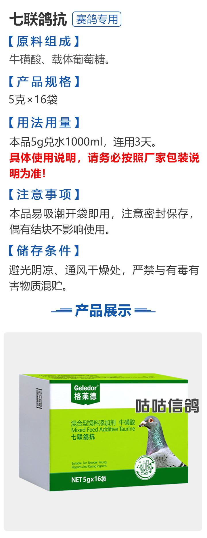 2026线上春展▪6元无门槛  -  指定商品:【爆灯】蓝精零 5克×10包 ;【爆灯】鸽滴威 5克×10包 ;【爆灯】莎门停 5克×10包 ;【爆灯】崇威灵 5克×10包 体内虫;【爆灯】益南混甘 5克×10包 ;【爆灯】回利球 5克×10包 ;【心连心】滴莎 10克×6袋;【爆灯】乎滴亢 5克×10包 ;【爆灯】超浓缩喜乐菌 500毫升 ;【心连心】球莎 10克×6袋 ;【爆灯】维诺护肝精 250毫升 ;【爆灯】虱螨体虫清 500毫升 ;【心连心】呼畅 10克×6袋 ;【爆灯】球可定 100毫升 ;【爆灯】复合预混合饲料Ⅱ维益菌 227克 ;【心连心】瘟痢停 10克×6袋 ;【爆灯】肠道宝 500克 ;【心连心】莎J净 10克×6袋 ;【心连心】鸽C净 10克×6袋 ;【顶峰】复合菌(胶囊)100粒 ;【顶峰】复合菌(粉剂) 280克 ;【顶峰】能量钙(浓缩型) 400毫升 ;【爱丽丝】喉痢清(加强型) 60粒(胶囊) ;【顶峰】能量钙(浓缩型) 2.5升 ;【爱丽丝】衣元净 60粒(胶囊);【施德福】特号六合一混合剂 5克×10包 ;【爱丽丝】毛滴虫净 60粒(胶囊);【爱丽丝】刹杆净(原沙门氏菌大肠杆菌杀星) 60粒(胶囊);【施德福】口服苗A 5克×10包 ;【爱丽丝】肝精 5克×10袋 ;【施德福】卡尼丁肝肾液 250毫升 ;【施德福】精华液 250毫升 ;【爱丽丝】呼吸道特号 60粒 (胶囊) ;【施德福】口服苗液 25毫升 ;【天津版稳拿】稳拿一号(呼吸道) 2公克×8袋 呼吸道;【天津版稳拿】稳拿二号(消化肠道) 3公克×8袋 肠道;【天津版稳拿】稳拿七号(毛滴虫) 2公克×8袋 毛滴虫;【上海龙园】魔宝 1000克 袋装;【上海龙园】维他肝精 250毫升 ;【上海龙园】鸽绿茶 100克 ;【上海龙园】浴宝 200克 ;【上海龙园】小育雏宝胶囊 100粒 ;【上海龙园】菌乐多 500毫升;【先锋】呼喉霸 5克×10包;【先锋】依原净 5克×10包 ;【西安凯鸽】客线枉 30毫升;【西安凯鸽】至樽独霸 100克;【西安凯鸽】至樽独霸 60粒(胶囊);【爆灯】T5鸽疫快克 20毫升 ;【西安凯鸽】果蔬营养丸 700克;【西安凯鸽】果蔬营养丸 2000克;【天津版稳拿】稳拿三号 2克×8包 球虫;【天津版稳拿】幼鸽夺霸 100粒 ;【天津版稳拿】幼鸽夺霸 300粒 ;【天津版稳拿】比赛夺霸3号 100粒 ;【天津版稳拿】比赛夺霸3号 300粒 ;【心连心】毛莎胶囊 60粒 ;【心连心】球锋胶囊 60粒 ;【天津版稳拿】虫清 3克×8包 体内虫;【心连心】呼畅 60粒(胶囊) ;【天津版稳拿】喉清 3克×8包 支原体/衣原体/念珠菌/呼吸道;【心连心】瘟痢停 60粒(胶囊) ;【天津版稳拿】粮霉清 200克 ;【心连心】莎J净胶囊 60粒 ;【爆灯】一滴灵 10毫升 单眼伤风;【爆灯】呼鼻灵 10毫升 ;【心连心】鸽C净 60粒(胶囊) ;【爆灯】维诺速补 100粒 ;【爆灯】老鸟回春丸 100粒 ;【心连心】毛呼二合一 10克×6袋;【爆灯】老鸟生子丸 100粒;【爆灯】依圆青 5克×10袋 ;【心连心】百消砃 100丸 ;【爆灯】泰力福 5克×10袋 呼吸道;【心连心】百消潵 150克 ;【爆灯】卫康防火墙 500毫升 ;【爆灯】矿力高峰液 250毫升;【心连心】独利双清 250毫升 ;【心连心】二合一啤酒酵母粉 600克 ;【爆灯】钙力奇 250毫升;【心连心】益酶多维电解质 150克 ;【爆灯】本草亢独饮 250毫升 ;【心连心】强化肝精(粉剂) 10克×10袋 ;【先锋】呼爽先锋 5克×10包 ;【心连心】强化肝精浓缩液 120毫升 ;【先锋】呼毛二合一 5克×10包 ;李猛推荐【爆灯】鸽疫康 500毫升 ;【先锋】先锋三合一 5克×10包 球虫/毛滴虫/沙门氏;【心连心】生物多肽矿物磷钙粉 500克 ;【先锋】净滴先锋 5克×10包;【心连心】AM活菌浓缩液 500毫升 ;【先锋】不脱翼 5毫升;李猛推荐【爆灯】维诺保 100毫升 ;【心连心】多效营养精华素 1680克 ;【心连心】AD3磷钙液 250毫升 ;【爆灯】超能素5000 1500克袋装 ;【心连心】瘟痢停丸 60丸 ;【爆灯】复合预混合饲料/6合1能量营养素 250克 ;【心连心】优益活菌液 1000毫升 ;【爱丽丝】喉痢清 5克×10袋 ;【上海龙园】种鸽宝 300粒 ;【上海龙园】种鸽粉 200克 ;【爱丽丝】衣原净2代 5克×10袋 ;【上海龙园】一喷灵 25毫升 ;【爱丽丝】毛滴净 5克×10袋 ;【上海龙园】绿色精 500毫升;【爱丽丝】刹杆净(原沙门氏菌大肠杆菌杀星) 5克×10袋 ;【上海龙园】营养蒜油 200毫升;【爱丽丝】呼吸道特号 5克×10袋 ;【上海龙园】康飞力 200毫升;【顶峰】保比液 100毫升 ;【上海龙园】赛神滴眼液 10毫升 ;【爱丽丝】毛球二合一 5克×10袋 ;【上海龙园】一滴灵 10毫升 单眼伤风;【爱丽丝】毛滴虫球虫二合一 60粒 ;【上海龙园】泻必停 5克×10袋 ;【顶峰】牛至香酚保比液 500毫升 ;【上海龙园】喉必清 5克×10袋;【顶峰】商寒停 100片 伤寒停;【顶峰】能量钙 300克 ;【上海龙园】抗球粉 5克×10包;【爱丽丝】稳肠赢 100克 ;【顶峰】全能电解质 500毫升 ;【上海龙园】抗滴粉 5克×10包 ;【顶峰】维他酵母粉 800克 ;【上海龙园】电解质维生素C粉 (甲7.5克+乙12.5克)×10组盒;【上海龙园】小育雏宝片剂 100片;【上海龙园】大育雏宝胶囊 500粒;【上海龙园】嗉囊清 100毫升;【上海龙园】大育雏宝片剂 500片;【上海龙园】粒粒成 100粒;【上海龙园】克虫宝 80粒;【上海龙园】红茶 100克;【上海龙园】强健宝 750克;【凡赛尔】欧乐强 鸽浴粉 1000克 天然沐浴圣品/消除肌肉疲劳/洗澡/洗浴;【爱丽丝】钙磷营养速补 400片;【北斗】雌宝 100粒;【北斗】雄宝 100粒 ;【北斗】克立停 100粒;【北斗】育雏宝 300粒;【天津版稳拿】稳拿五号 3克×8包 单眼伤风;【爆灯】多关秘密武器 30毫升 ;【爆灯】