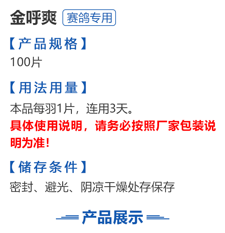 2026线上春展▪满1000-100  -  指定商品:【爆灯】蓝精零 5克×10包 ;【爆灯】鸽滴威 5克×10包 ;【爆灯】莎门停 5克×10包 ;【爆灯】崇威灵 5克×10包 体内虫;【爆灯】益南混甘 5克×10包 ;【爆灯】回利球 5克×10包 ;【心连心】滴莎 10克×6袋;【爆灯】乎滴亢 5克×10包 ;【爆灯】超浓缩喜乐菌 500毫升 ;【心连心】球莎 10克×6袋 ;【爆灯】维诺护肝精 250毫升 ;【爆灯】虱螨体虫清 500毫升 ;【心连心】呼畅 10克×6袋 ;【爆灯】球可定 100毫升 ;【爆灯】复合预混合饲料Ⅱ维益菌 227克 ;【心连心】瘟痢停 10克×6袋 ;【爆灯】肠道宝 500克 ;【心连心】莎J净 10克×6袋 ;【心连心】鸽C净 10克×6袋 ;【顶峰】复合菌(胶囊)100粒 ;【顶峰】复合菌(粉剂) 280克 ;【顶峰】能量钙(浓缩型) 400毫升 ;【爱丽丝】喉痢清(加强型) 60粒(胶囊) ;【顶峰】能量钙(浓缩型) 2.5升 ;【爱丽丝】衣元净 60粒(胶囊);【施德福】特号六合一混合剂 5克×10包 ;【爱丽丝】毛滴虫净 60粒(胶囊);【爱丽丝】刹杆净(原沙门氏菌大肠杆菌杀星) 60粒(胶囊);【施德福】口服苗A 5克×10包 ;【爱丽丝】肝精 5克×10袋 ;【施德福】卡尼丁肝肾液 250毫升 ;【施德福】精华液 250毫升 ;【爱丽丝】呼吸道特号 60粒 (胶囊) ;【施德福】口服苗液 25毫升 ;【天津版稳拿】稳拿一号(呼吸道) 2公克×8袋 呼吸道;【天津版稳拿】稳拿二号(消化肠道) 3公克×8袋 肠道;【天津版稳拿】稳拿七号(毛滴虫) 2公克×8袋 毛滴虫;【上海龙园】魔宝 1000克 袋装;【上海龙园】维他肝精 250毫升 ;【上海龙园】鸽绿茶 100克 ;【上海龙园】浴宝 200克 ;【上海龙园】小育雏宝胶囊 100粒 ;【上海龙园】菌乐多 500毫升;【先锋】呼喉霸 5克×10包;【先锋】依原净 5克×10包 ;【西安凯鸽】客线枉 30毫升;【西安凯鸽】至樽独霸 100克;【西安凯鸽】至樽独霸 60粒(胶囊);【爆灯】T5鸽疫快克 20毫升 ;【西安凯鸽】果蔬营养丸 700克;【西安凯鸽】果蔬营养丸 2000克;【天津版稳拿】稳拿三号 2克×8包 球虫;【天津版稳拿】幼鸽夺霸 100粒 ;【天津版稳拿】幼鸽夺霸 300粒 ;【天津版稳拿】比赛夺霸3号 100粒 ;【天津版稳拿】比赛夺霸3号 300粒 ;【心连心】毛莎胶囊 60粒 ;【心连心】球锋胶囊 60粒 ;【天津版稳拿】虫清 3克×8包 体内虫;【心连心】呼畅 60粒(胶囊) ;【天津版稳拿】喉清 3克×8包 支原体/衣原体/念珠菌/呼吸道;【心连心】瘟痢停 60粒(胶囊) ;【天津版稳拿】粮霉清 200克 ;【心连心】莎J净胶囊 60粒 ;【爆灯】一滴灵 10毫升 单眼伤风;【爆灯】呼鼻灵 10毫升 ;【心连心】鸽C净 60粒(胶囊) ;【爆灯】维诺速补 100粒 ;【爆灯】老鸟回春丸 100粒 ;【心连心】毛呼二合一 10克×6袋;【爆灯】老鸟生子丸 100粒;【爆灯】依圆青 5克×10袋 ;【心连心】百消砃 100丸 ;【爆灯】泰力福 5克×10袋 呼吸道;【心连心】百消潵 150克 ;【爆灯】卫康防火墙 500毫升 ;【爆灯】矿力高峰液 250毫升;【心连心】独利双清 250毫升 ;【心连心】二合一啤酒酵母粉 600克 ;【爆灯】钙力奇 250毫升;【心连心】益酶多维电解质 150克 ;【爆灯】本草亢独饮 250毫升 ;【心连心】强化肝精(粉剂) 10克×10袋 ;【先锋】呼爽先锋 5克×10包 ;【心连心】强化肝精浓缩液 120毫升 ;【先锋】呼毛二合一 5克×10包 ;李猛推荐【爆灯】鸽疫康 500毫升 ;【先锋】先锋三合一 5克×10包 球虫/毛滴虫/沙门氏;【心连心】生物多肽矿物磷钙粉 500克 ;【先锋】净滴先锋 5克×10包;【心连心】AM活菌浓缩液 500毫升 ;【先锋】不脱翼 5毫升;李猛推荐【爆灯】维诺保 100毫升 ;【心连心】多效营养精华素 1680克 ;【心连心】AD3磷钙液 250毫升 ;【爆灯】超能素5000 1500克袋装 ;【心连心】瘟痢停丸 60丸 ;【爆灯】复合预混合饲料/6合1能量营养素 250克 ;【心连心】优益活菌液 1000毫升 ;【爱丽丝】喉痢清 5克×10袋 ;【上海龙园】种鸽宝 300粒 ;【上海龙园】种鸽粉 200克 ;【爱丽丝】衣原净2代 5克×10袋 ;【上海龙园】一喷灵 25毫升 ;【爱丽丝】毛滴净 5克×10袋 ;【上海龙园】绿色精 500毫升;【爱丽丝】刹杆净(原沙门氏菌大肠杆菌杀星) 5克×10袋 ;【上海龙园】营养蒜油 200毫升;【爱丽丝】呼吸道特号 5克×10袋 ;【上海龙园】康飞力 200毫升;【顶峰】保比液 100毫升 ;【上海龙园】赛神滴眼液 10毫升 ;【爱丽丝】毛球二合一 5克×10袋 ;【上海龙园】一滴灵 10毫升 单眼伤风;【爱丽丝】毛滴虫球虫二合一 60粒 ;【上海龙园】泻必停 5克×10袋 ;【顶峰】牛至香酚保比液 500毫升 ;【上海龙园】喉必清 5克×10袋;【顶峰】商寒停 100片 伤寒停;【顶峰】能量钙 300克 ;【上海龙园】抗球粉 5克×10包;【爱丽丝】稳肠赢 100克 ;【顶峰】全能电解质 500毫升 ;【上海龙园】抗滴粉 5克×10包 ;【顶峰】维他酵母粉 800克 ;【上海龙园】电解质维生素C粉 (甲7.5克+乙12.5克)×10组盒;【上海龙园】小育雏宝片剂 100片;【上海龙园】大育雏宝胶囊 500粒;【上海龙园】嗉囊清 100毫升;【上海龙园】大育雏宝片剂 500片;【上海龙园】粒粒成 100粒;【上海龙园】克虫宝 80粒;【上海龙园】红茶 100克;【上海龙园】强健宝 750克;【凡赛尔】欧乐强 鸽浴粉 1000克 天然沐浴圣品/消除肌肉疲劳/洗澡/洗浴;【爱丽丝】钙磷营养速补 400片;【北斗】雌宝 100粒;【北斗】雄宝 100粒 ;【北斗】克立停 100粒;【北斗】育雏宝 300粒;【天津版稳拿】稳拿五号 3克×8包 单眼伤风;【爆灯】多关秘密武器 30毫升 ;【爆灯】维